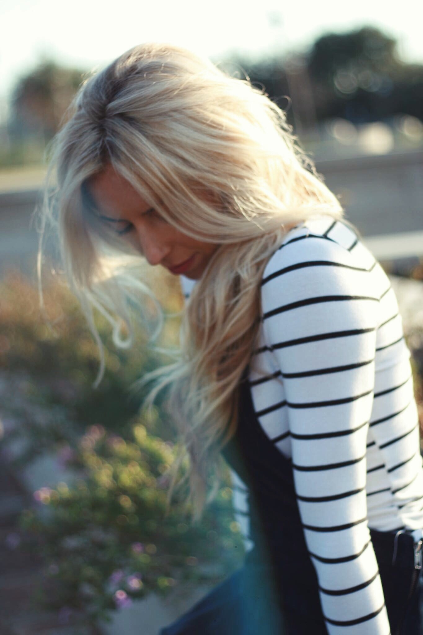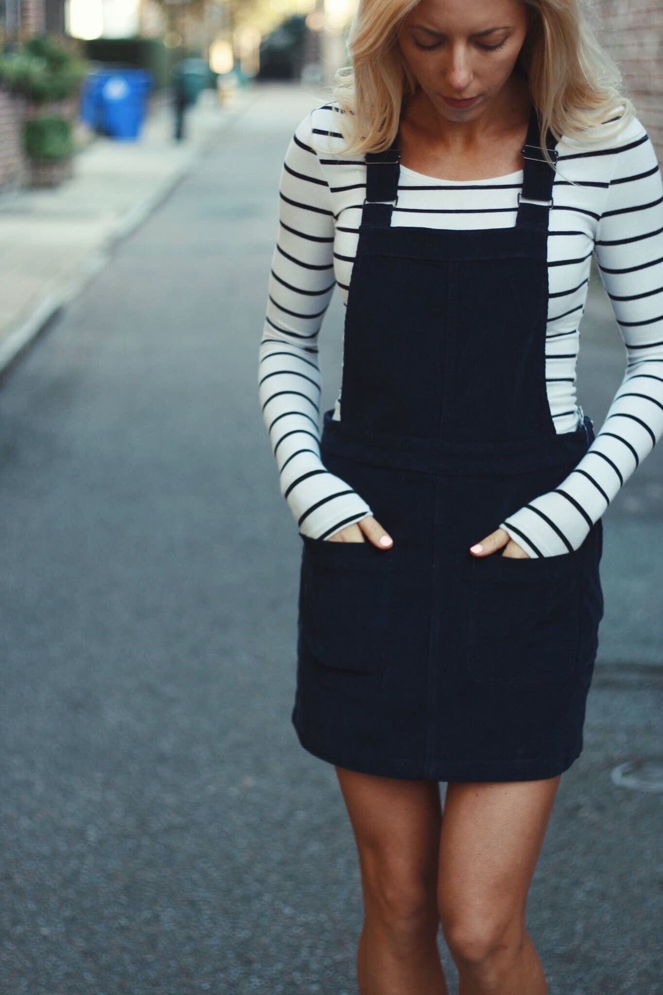 Kenzie’s Outfit: BDG Corduroy Pinafore Dress (Urban Outfitters), Striped Long Sleeve (H&M a few years ago), Black Booties(Zara)