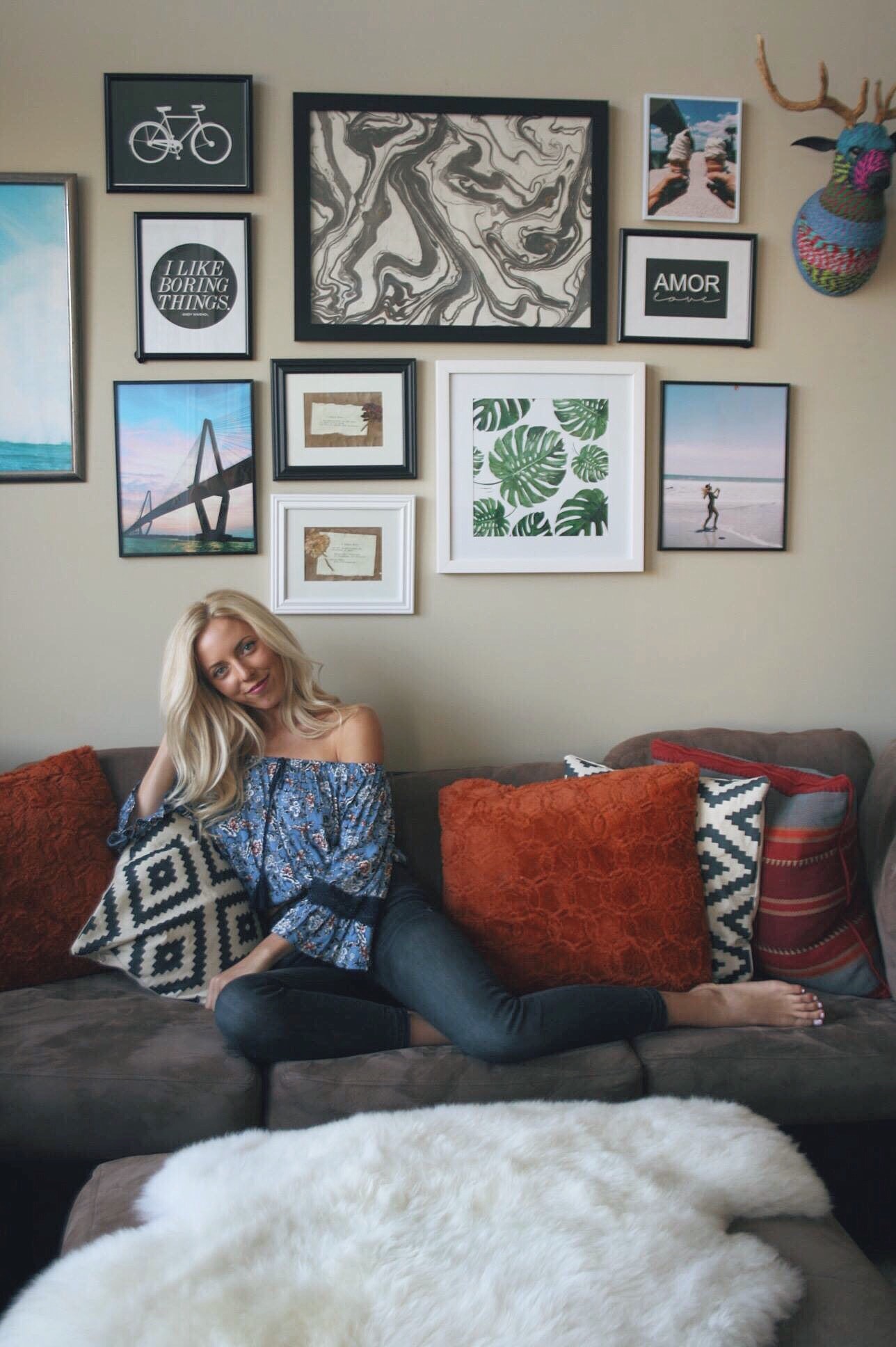 It’s officially SPRING y’all and we are stoked about it! Since we have decided we are staying in Charleston for a while we thought it was time to make our apartment feel more like a home. We have amazing high ceilings and we thought what better way to showcase it than by creating a gallery wall. Being on a tight budget means printing off our own photographs and buying frames from the dollar store to hang on our wall. By no means does it look professional but it is us and adds some character to our sweet little apartment. We call this master piece: “The wall of random S@*!”